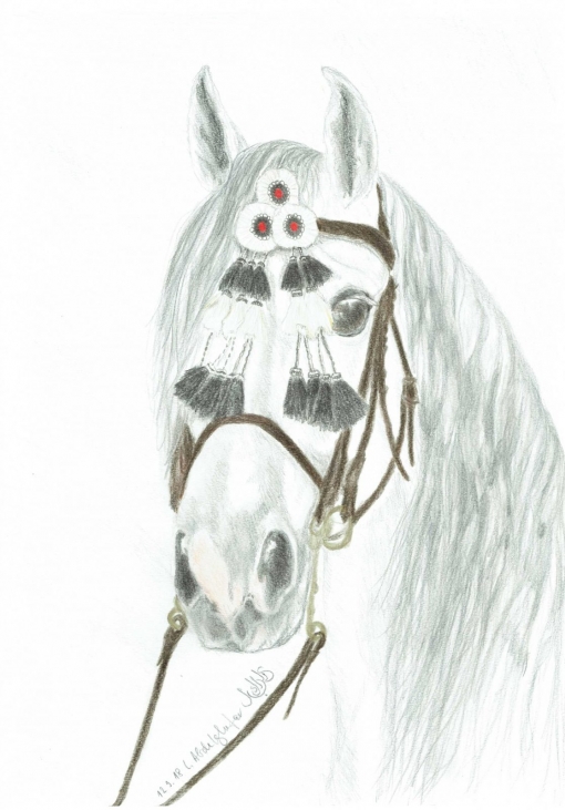 Diese Buntstiftzeichnung zeigt das fein ausgearbeitete Porträt Andalusier-Hengtes mit traditioneller Zäumung. Im Fokus steht der Kopf des Pferdes, der im Profil dargestellt ist und sich durch markante, elegante Züge auszeichnet. Die großen, ausdrucksstarken Augen und die aufmerksam gespitzten Ohren verleihen dem Tier eine lebendige und würdevolle Ausstrahlung. Die Mähne ist in weichen, fließenden Strichen gezeichnet, die die Textur des Pferdehaars geschickt einfangen. Insgesamt vermittelt die Zeichnung eine Mischung aus technischer Präzision und künstlerischer Sensibilität. Sie fängt nicht nur die physische Schönheit des Pferdes ein, sondern auch seinen noblen Charakter und seine Anmut.