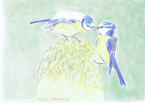 Diese zarte und anmutige Zeichnung zeigt zwei Blaumeisen in einer liebevollen Interaktion. Die Vögel sind mit weichen Buntstiftstrichen in Blau-, Gelb- und Grautönen dargestellt, die ihrem charakteristischen Gefieder entsprechen. Die Vögel sitzen auf einer skizzenhaft angedeuteten, gelblich-grünen Kugel. Der Hintergrund ist in einem sanften Mintgrün gehalten, was der Szene eine friedliche, frühlingshafte Atmosphäre verleiht. Ein Vogel ist leicht erhöht positioniert und beugt sich zu seinem Gefährten hinunter, als würde er ihm etwas zuflüstern oder ihn füttern. Diese Geste vermittelt ein Gefühl von Intimität und Fürsorge zwischen den beiden Tieren. Die Zeichnung ist in einem lockeren, skizzenhaften Stil gehalten, der die Lebendigkeit und Zartheit der Vögel einfängt. Die pastellartigen Farben und die weichen Linien erzeugen eine träumerische, fast aquarellartige Qualität. Diese Darstellung zweier Blaumeisen in einem Moment der Zweisamkeit ist sowohl naturalistisch als auch poetisch.