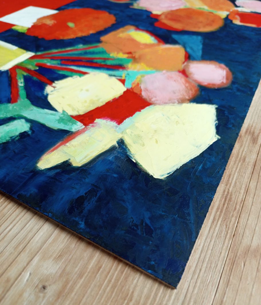Stillleben 51 x 41 x 0,3 cm., Öl auf Hartfaserplatte.
