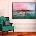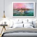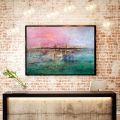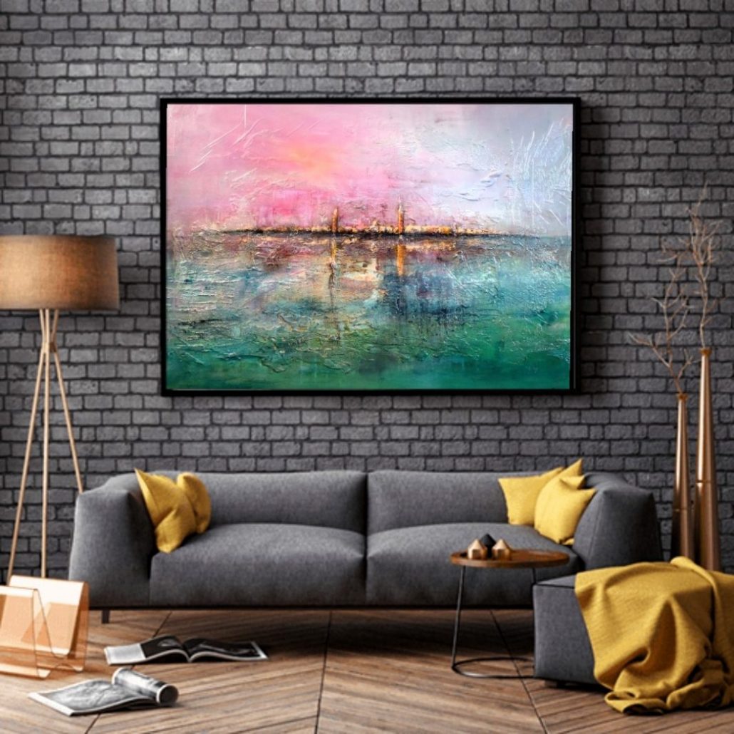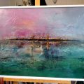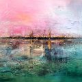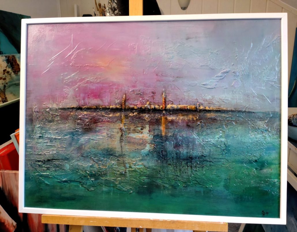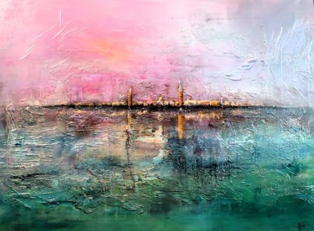 Dieses Bild ist ein sehr romantisches Gemälde in wundervollen verträumten Farben von zartem Grün, Blau, Fliederfarben, Rosé, Weiß und Gold. Das Gemälde ist leicht abstrahiert und der erste Gedanke lässt Erinnerungen an Venedig war werden. Die Goldeffekte spiegeln die Lichtschimmer auf dem Wasser wieder. Dadurch bekommt das Bild einen edlen, aber auch einen verträumten Charakter. Dieses Kunstwerk ist mit Acryl auf Leinen, Malkarton und Goldfolie gemalt. Durch die Verwendung der Goldfolie entsteht auf dem Bild eine wunderbare Struktur mit einer einmalig schönen unvergleichbaren Haptik, ein Unikat. Das Kunstwerk ist mit glänzendem Firnis versiegelt und in der rechten unteren Ecke signiert. Es ist in einem weißen Holzrahmen montiert und kann direkt aufgehängt werden.
