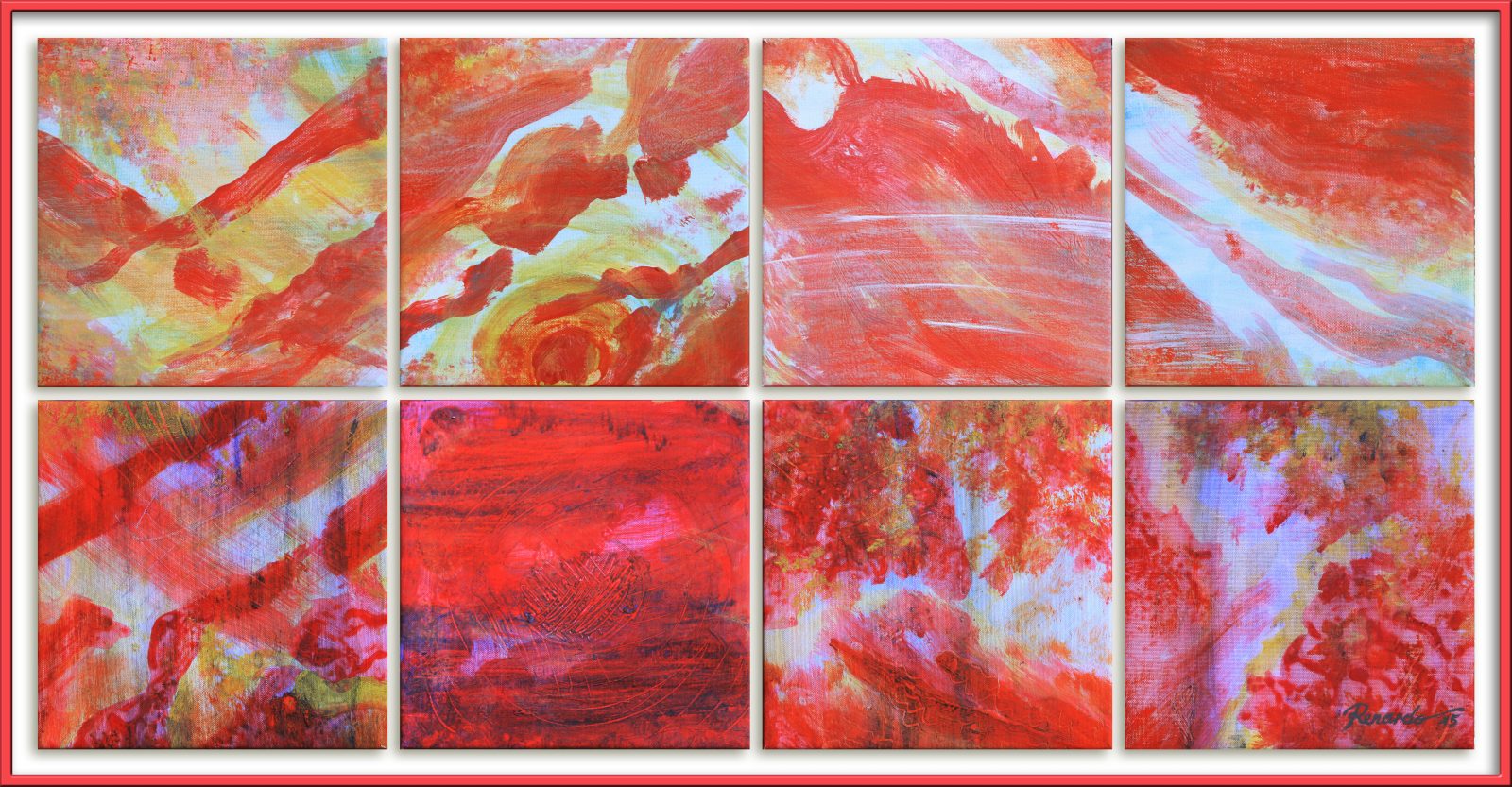 mehrschichtiger Farbauftrag in Acryl auf Künstlerleinen – Holzkeilrahmen und rot/weissem Schattenrahmen – 8-teilig – ca. 96 x 48 cm