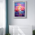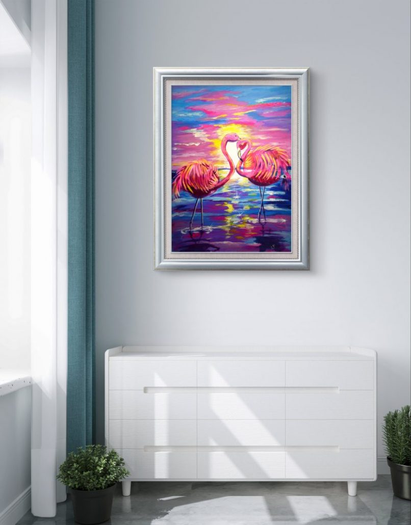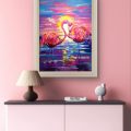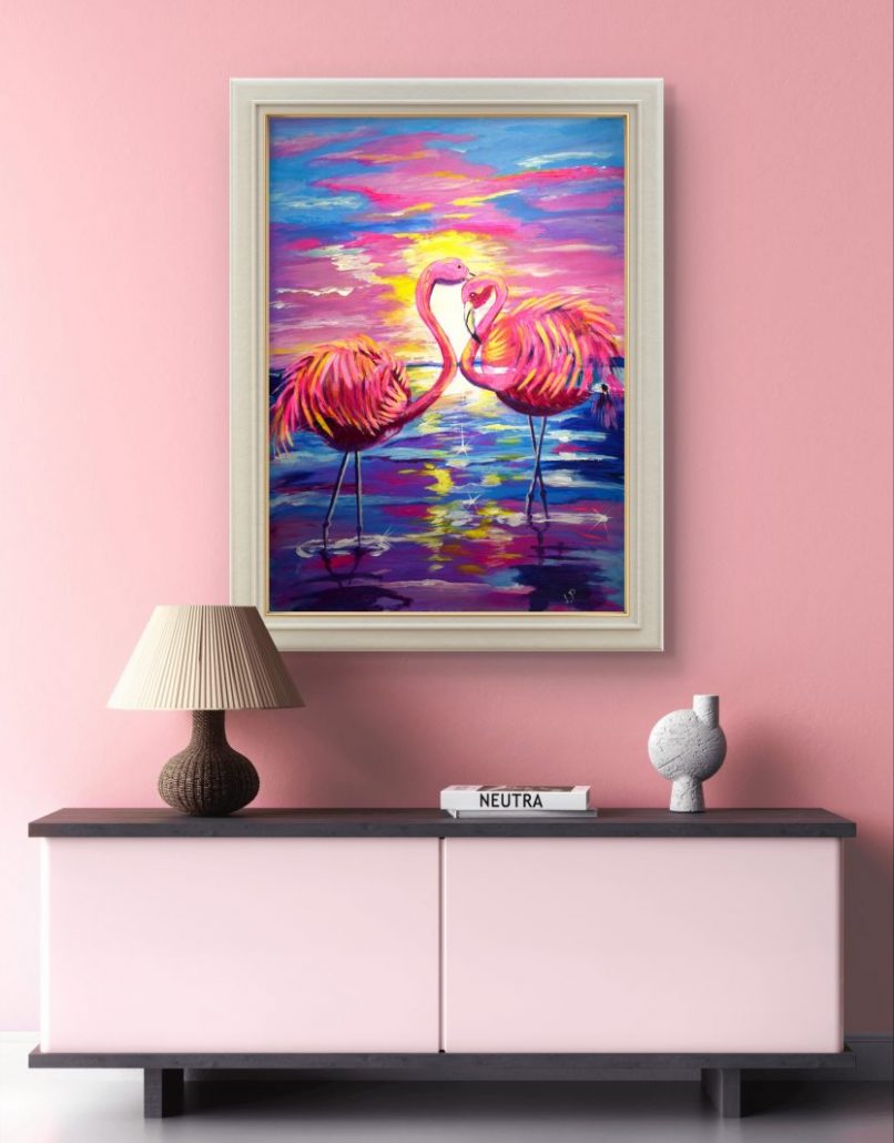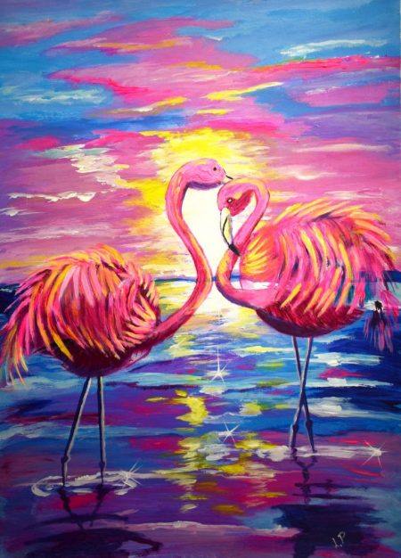 In diesem faszinierenden Gemälde stellt der Künstler einen ruhigen Moment dar, in dem rosa Flamingos in den leuchtenden Farben eines atemberaubenden Sonnenuntergangs getaucht sind. Die Farbwahl erweckt die Szene zum Leben und spiegelt die anmutige Eleganz der Flamingos wider. Der abstrakte Stil verstärkt die traumhafte Qualität und ermöglicht es dem Betrachter, die Ruhe und die reflektierende Schönheit dieses künstlerischen Ausdrucks zu erfassen.