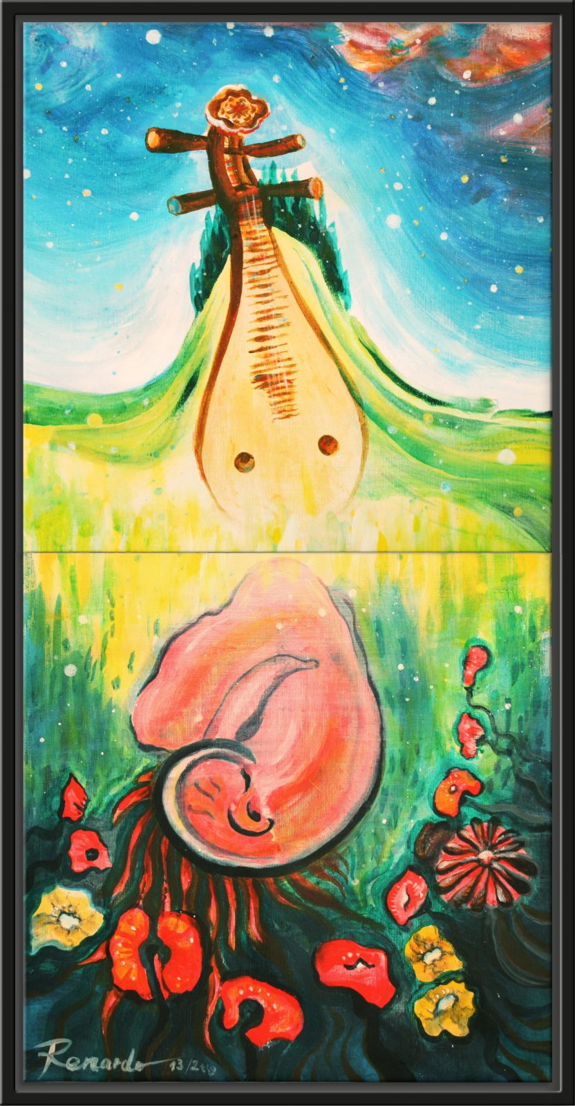 Acryl mit Rahmung ca 40 x 80 cm, mehrschichtiger Farbauftrag auf Künstler-Leinen,2013 mit 3D-Holz-Keilrahmen und Schattenrahmen