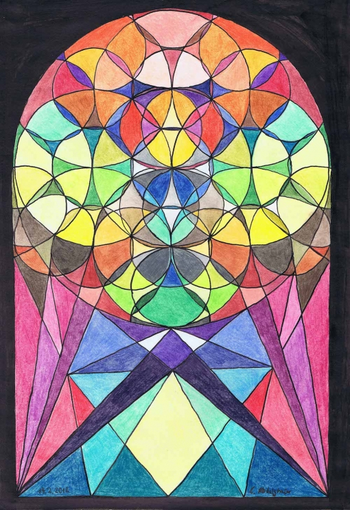 Diese Zeichnung präsentiert ein faszinierendes geometrisches Muster in der Form eines Kirchenfensters. Die Komposition besteht aus vielen sich überschneidenden Kreisen und Linien, die zahlreiche verschiedenförmige Segmente erzeugen. Jedes dieser Segmente ist mit einer anderen leuchtenden Farbe gefüllt, darunter Rot, Orange, Gelb, Grün, Blau, Violett und verschiedene Pastelltöne. Der obere Teil des Bildes ist eher kreisförmig und erinnert an eine Rose oder ein Mandala. Nach unten hin verjüngt sich das Muster und endet in einer Spitze, was die charakteristische Form eines gotischen Kirchenfensters nachahmt. Die verwendete Technik Farbstift steht im Kontrast zu dem dunklen Hintergrund. Die schwarzen Linien, die die farbigen Segmente umranden, verstärken diesen Effekt noch. Insgesamt strahlt das Kunstwerk eine hypnotische, kaleidoskopartige Qualität aus. Es lädt den Betrachter ein, sich in den Details zu verlieren und die Harmonie der Farben und Formen zu erkunden.