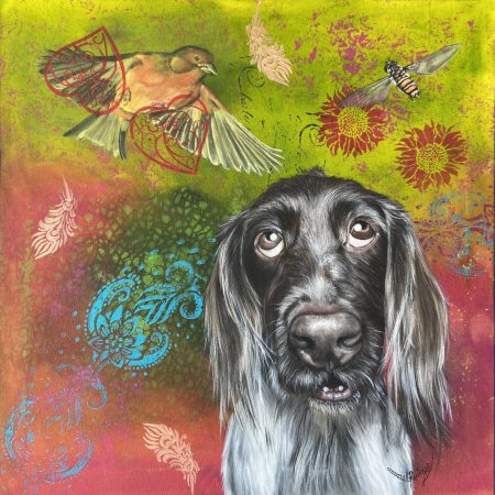 In meinem Werk vereine ich mit Acryl die Kraft des Realismus und die Leidenschaft der Natur. Die treuen Augen des Hundes erzählen Geschichten von Sehnsucht und Freiheit, ergänzt durch die unbeschwerte Eleganz des Vogels und das emsige Summen der Biene. Die farbenfrohen, ornamentalen Muster beleben das Bild und bringen eine fröhliche Energie in jeden Raum, die Inspiration und ein Gefühl von Freiheit schenkt.