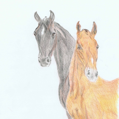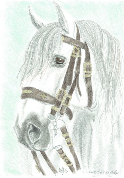 Diese Buntstiftzeichnung zeigt einen edlen Lusitanohengstes mit einer prunkvollen Zäumung. Die Zeichnung fängt die charakteristischen Merkmale dieses Hengstes ein mit seinen großen, sanften Augen und aufmerksam gespitzten Ohren. Die Nüstern sind etwas aufgebläht, was auf eine innere Unruhe des Pferdes schliessen lässt. Er schaut am Betrachter vorbei und sieht etwas, was ihn interessiert. Besonders detailliert ausgearbeitet ist die Mähne des Pferdes, die in weichen, fließenden Linien dargestellt ist und dem Bild eine natürliche Textur verleiht. Das Zaumzeug ist ein weiterer Blickfang der Zeichnung. Es besteht aus dunklen Lederriemen, die mit goldenen Beschlägen und Schnallen verziert sind. Diese Details verleihen dem Porträt eine zusätzliche Eleganz und Raffinesse. Insgesamt vermittelt die Zeichnung eine gelungene Mischung aus technischer Präzision und künstlerischer Sensibilität. Sie fängt nicht nur die physische Schönheit des Pferdes ein, sondern auch seinen sanften, noblen Charakter.