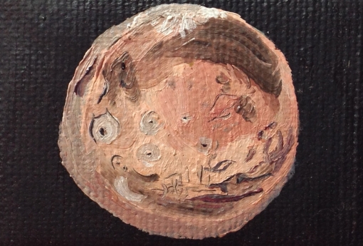 Dieses Ölgemälde zeigt eine beeindruckende Darstellung des Mars. Das Bild ist auf einem dunklen, fast schwarzen Hintergrund gemalt, wodurch der rötlich-orange Planet stark hervorsticht. Die Oberfläche des Planeten ist detailliert mit verschiedenen Texturen und Strukturen dargestellt. Man kann deutlich Krater, Erhebungen und Vertiefungen erkennen, die der Oberfläche eine realistische, raue Textur verleihen. Insgesamt vermittelt das Gemälde einen starken Eindruck von der rauen, unwirtlichen Schönheit des Mars. Es ist ein faszinierendes Stück, das die Vorstellungskraft anregt und den Betrachter einlädt, über die Geheimnisse und Wunder unseres Nachbarplaneten nachzudenken. Die Kombination aus realistischer Darstellung und künstlerischer Interpretation macht dieses Werk zu einem eindrucksvollen Beispiel für astronomische Kunst. Zudem scheint es dass der Mars vor lächelt vor sich in lächelt bei dem Gedanken, dass der Mensch ihn erobert!
