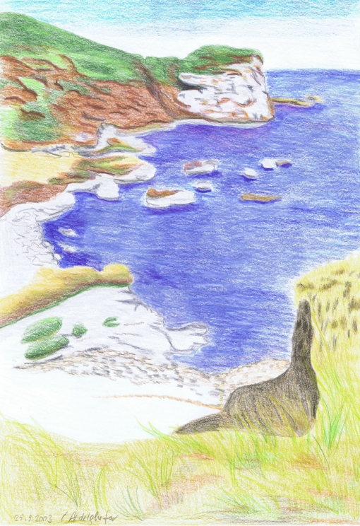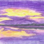 Diese stimmungsvolle Buntstiftzeichnung fängt einen atemberaubenden Sonnenuntergang am Meer ein. Mit lebendigen Farben und sanften Übergängen wird eine faszinierende Abendstimmung geschaffen. Dabei dominieren Violett- und Purpurtöne, die dem Bild eine traumhafte, fast surreale Atmosphäre verleihen. Leuchtend gelbe Wolken am Himmel, erzeugen den dramatischen Kontrast der untergehenden Sonne. Zarte Spiegelungen des Himmels auf der Wasseroberfläche, vermitteln Tiefe und Ruhe. Mit wenigen Strichen und einer begrenzten Farbpalette ist es gelungen eine intensive Stimmung zu erzeugen. Die Zeichnung lädt den Betrachter ein, in die Ruhe und Schönheit eines außergewöhnlichen Naturschauspiels einzutauchen.