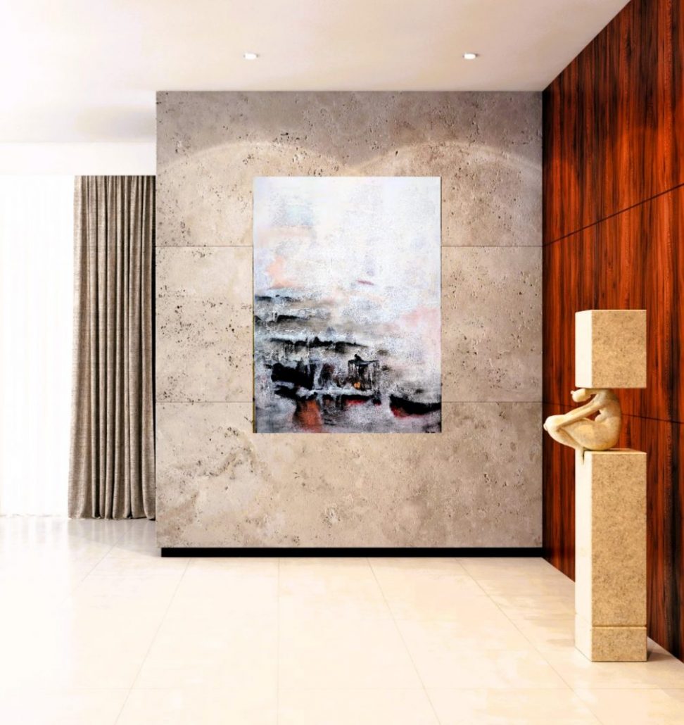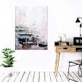 Das Bild Nepal ist ein sehr ruhiges, dezentes Gemälde in zarten Pastellfarben beige, rose, kombiniert mit schwarz und einem bronzefarbenen metallischen Akzent.