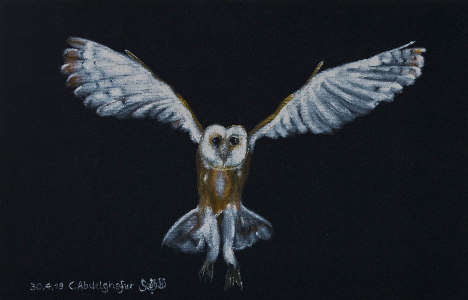 Dieses beeindruckende Gemälde zeigt eine Schleiereule im Flug, dargestellt auf einem tiefschwarzen Hintergrund aus Samt. Mit Präzision wurden die feinen Federn der Flügel in zarten Grau- und Weisstönen gemalt, was die Textur derselben betont. Der Körper ist ein warmen Braunton gemalt. Die grossen, dunklen Augen fixieren den Betrachter. Die herzförmige Struktur des Kopfes macht das Tier noch sympathischer. Die Malweise vermittelt eine Mischung aus Realismus und künstlerischer Interpretation. Die weichen Übergänge und der geschickte Einsatz von Licht und Schatten verleihen dem Bild eine fast dreidimensionale Qualität und schafft durch den dunklen Hintergrund eine dramatische, fast mystische Atmosphäre. Die Technik Öl auf Samt wird sehr selten angewendet, da sie sehr aufwändig und schwierig ist.