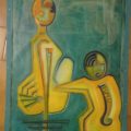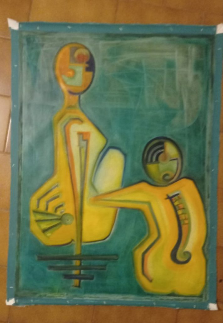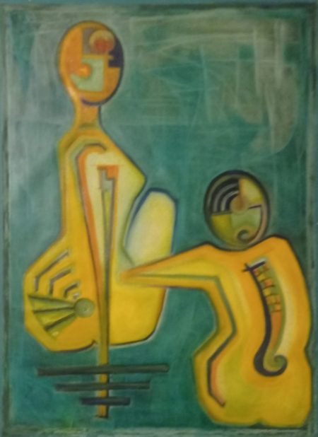 Persona Konstrukta Persona ist ein Ölgemälde mit zwei weiblichen Personen in sitzender Position. Der Hintergrund ist grün gehalten, und die Figuren wurden mit Farbpigment gemalt.