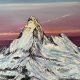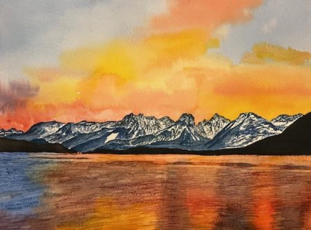Das Aquarellgemälde zeigt eine beeindruckende Szenerie mit rotglühenden Föhnschiffchen, die in den sanften Wellen auf der Wasseroberfläche gespiegelt werden.
