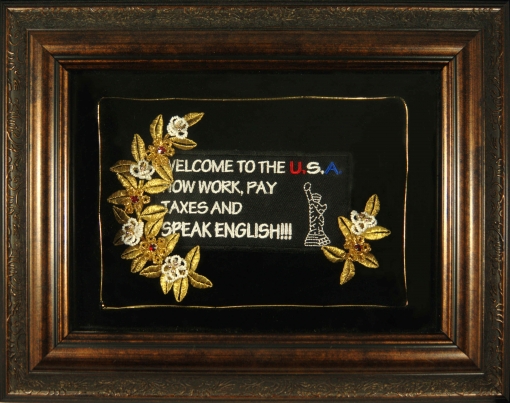 Technik: Mixed Media (Golddraht, Goldfolie, Perlen, Samt, Patch, Holz, Glas)