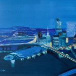 Das Bild zeigt eine stimmungsvollen Sonnenuntergang der großen, leuchtend orangefarbenen Sonne am Himmel. Die Sonne dominiert die obere Bildhälfte und strahlt in warmen Gelb- und Orangetönen, umgeben von einem leichten Dunstschleier. Der Himmel ist in intensiven Violetttönen gehalten. Diese intensive violette Färbung verleiht dem Bild eine geheimnisvolle, fast magische Atmosphäre. Im unteren Bildteil sind die dunklen Silhouetten von Bäumen und Büschen zu erkennen, die sich gegen den Nachthimmel abheben. Ihre unscharfen Konturen verstärken den träumerischen Charakter der Szene. Die Malweise ist expressiv, mit sichtbaren Pinselstrichen, die dem Werk Bewegung und Lebendigkeit verleihen. Die Kontraste zwischen den warmen und kühlen Farben sowie zwischen Licht und Schatten erzeugen eine faszinierende visuelle Spannung.