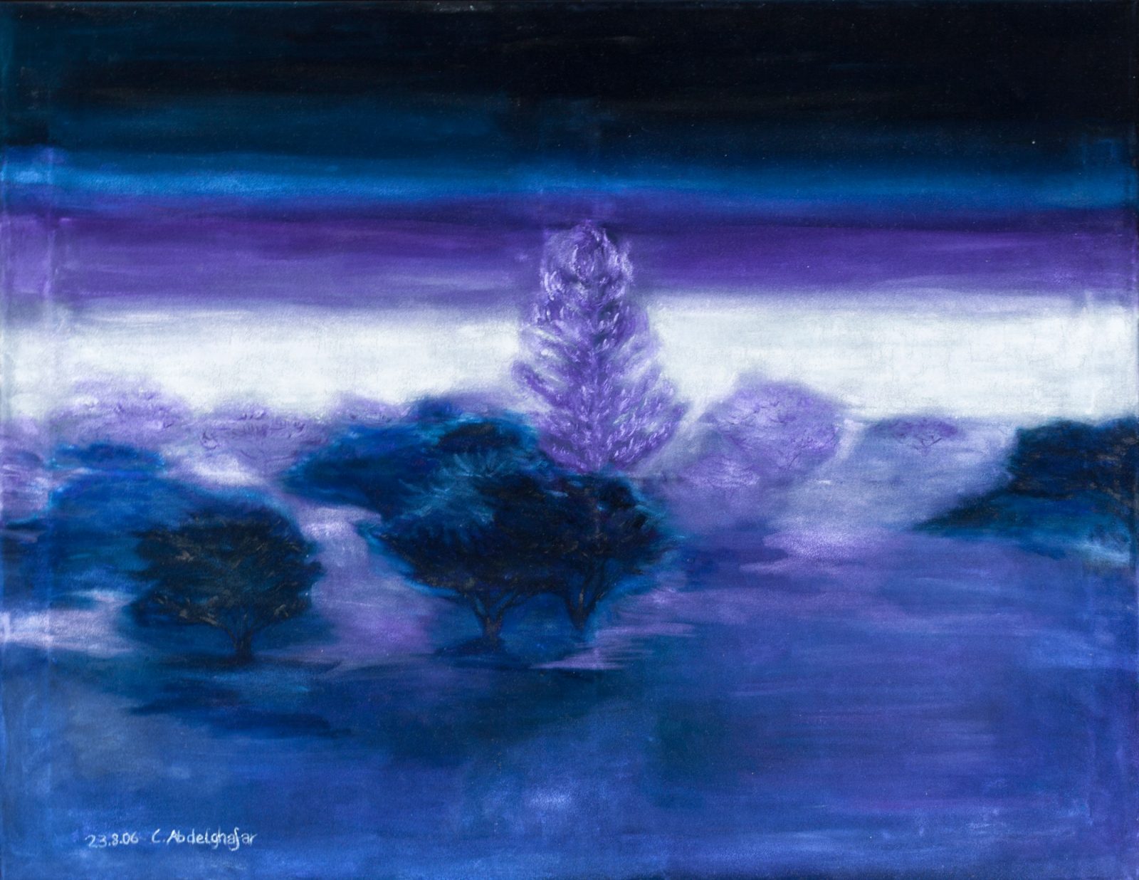 Dieses atmosphärische Ölgemälde präsentiert eine traumhafte Landschaft in einer faszinierenden Farbkomposition aus Blau- und Violetttönen. Die surreale, nächtliche Szene entstammt der Realität, die den Betrachter aber trotzdem in eine mystische Welt entführt. Im Vordergrund sind die Silhouetten von Bäumen zu erkennen, die in tiefen Blautönen gehalten sind und sich gegen einen violetten Himmel abheben. Das zentrale Element des Bildes ist ein auffälliger, violetter Baum in der Mitte der Komposition. Diese Form ragt empor und scheint fast zu leuchten, was ihr eine übernatürliche Präsenz verleiht. Insgesamt erzeugt das Bild eine Atmosphäre von Ruhe und gleichzeitig mysteriöser Spannung. Es lädt den Betrachter ein, in diese mystische anmutende Landschaft einzutauchen und seine eigenen Interpretationen zu finden. Ob da wohl irgendwo ein Geist auftaucht?! Die Technik Öl auf Samt wird sehr selten angewendet, da sie sehr aufwändig und schwierig ist.