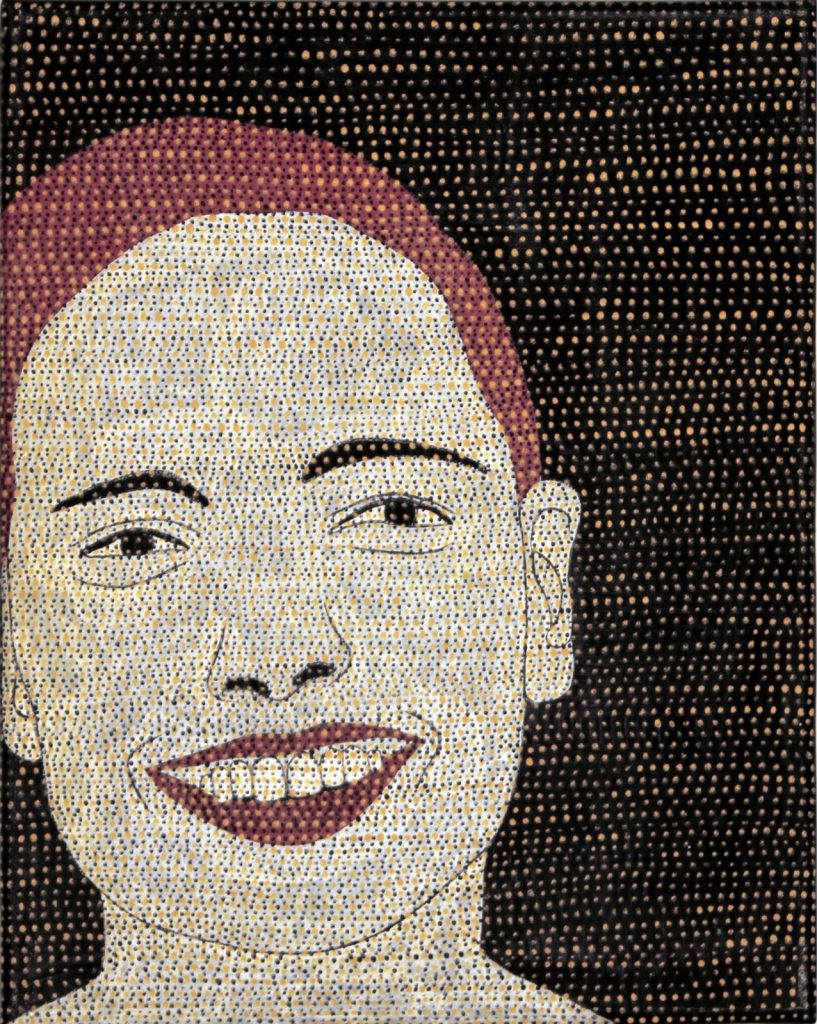 Dieses Bild stammt aus der Serie "Wer Bin ich?", in der Frauen abgebildet werden, jedoch ohne Portraitcharakter. Hier handelt es sich nicht um die Darstellung einer bestimmten Frau, sondern um Mimik, Ausdruck und Stimmung. Es wurde nur mit vier Farben gearbeitet, welche erst durch die darüber gesetzten Punkte optisch gemischt werden.