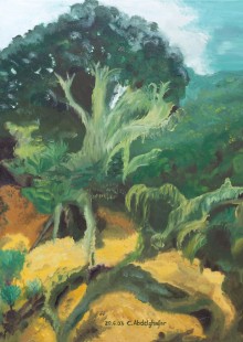 Claudia Luethi alias Abdelghafar, 2003Dieses Ölgemälde zeigt eine üppige, tropische Landschaft mit einem großen Baum mit einem dicken, hellgrünen Stamm und einer dichten, dunkelgrünen Krone.